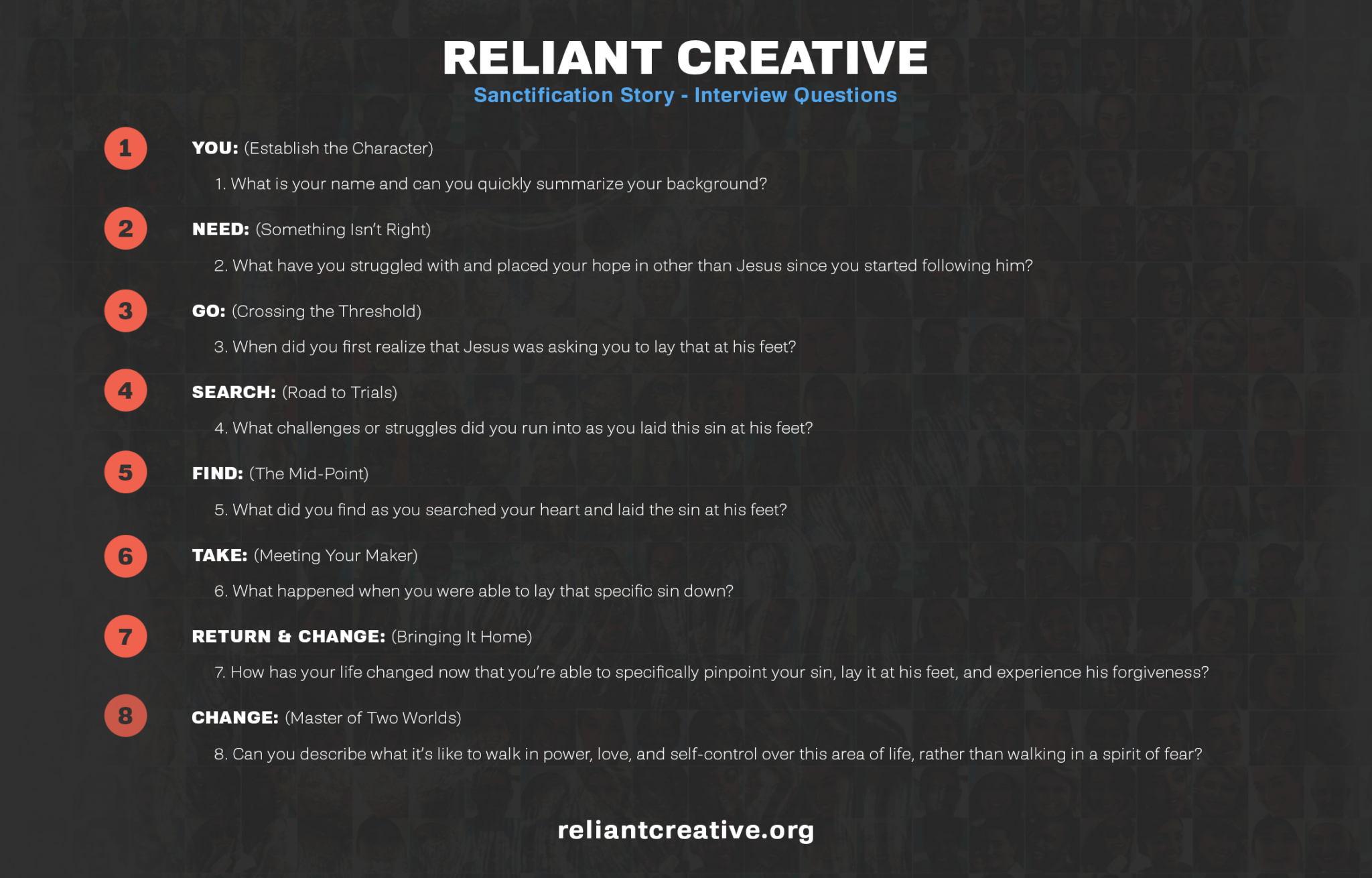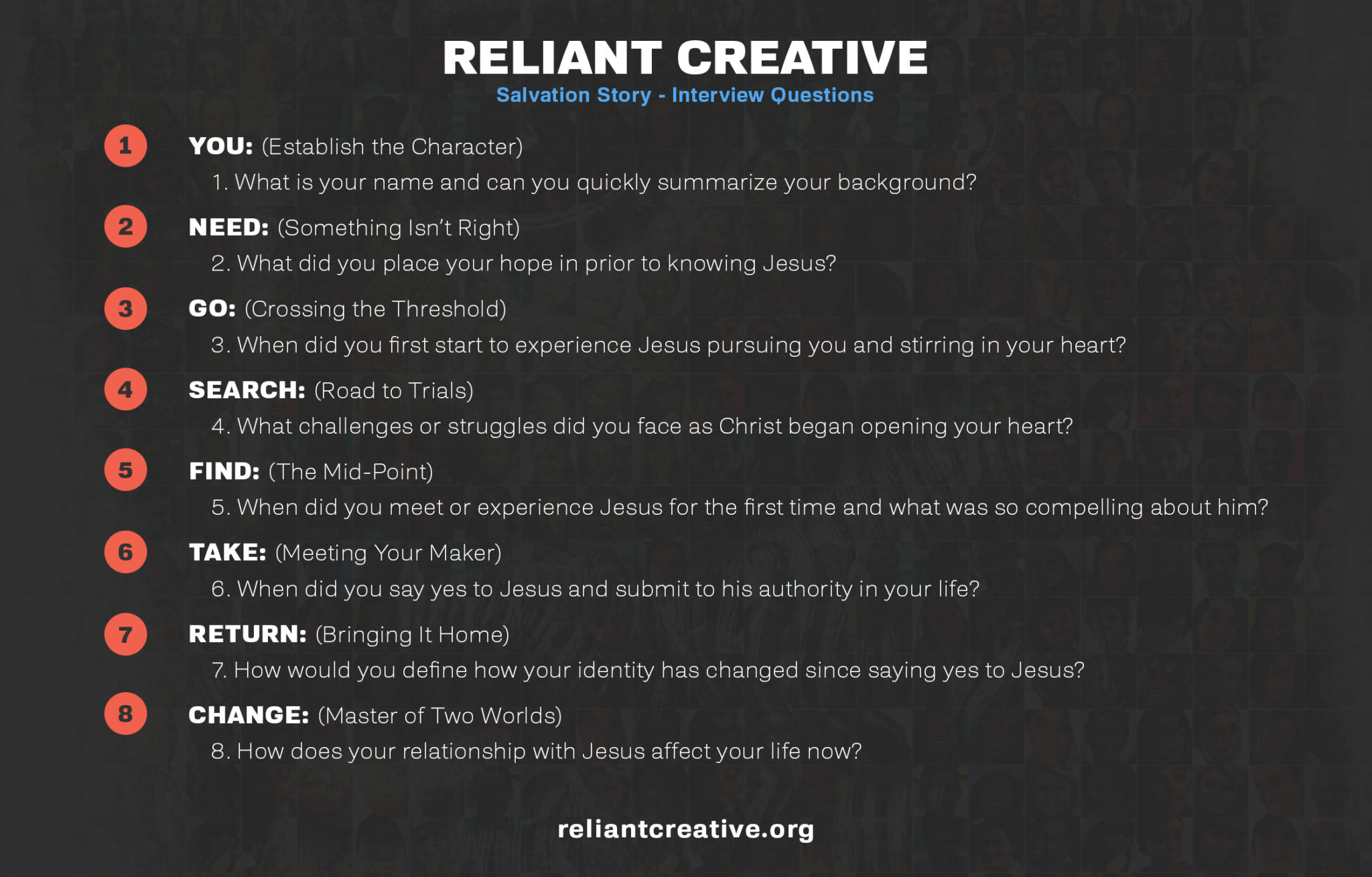 In order for this strategy to work, you have to ask the right questions in the right order. The Hero’s Journey gives us a structure out of which we can develop and write questions that will ensure the story being told is a relatable story. Luckily, we’ve already done all of the heavy lifting and created a few question sets you can use to tell great stories. We’ve got questions for a Salvation Story or a Sanctification Journey Story. Let your storyteller decide what story they want to tell based on the questions they resonate with the most, and then use those questions as the guide for the interview conversation.